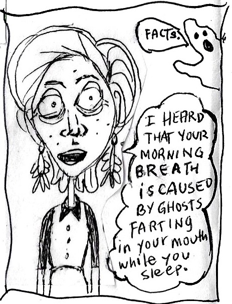 Ghost Facts Posted bythebluntlettersMay 30, 2022May 25, 2022Posted inUncategorizedTags:comedy, Comedy podcast, comic, comics, facts, fanzine, fanzines, farts, female artist, female comic, funny, ghost farts, ghosts, single panel comic, zine, zines comic from issue #11 Share this: Click to share on X (Opens in new window) X Click to share on Facebook (Opens in new window) Facebook Like Loading... Related