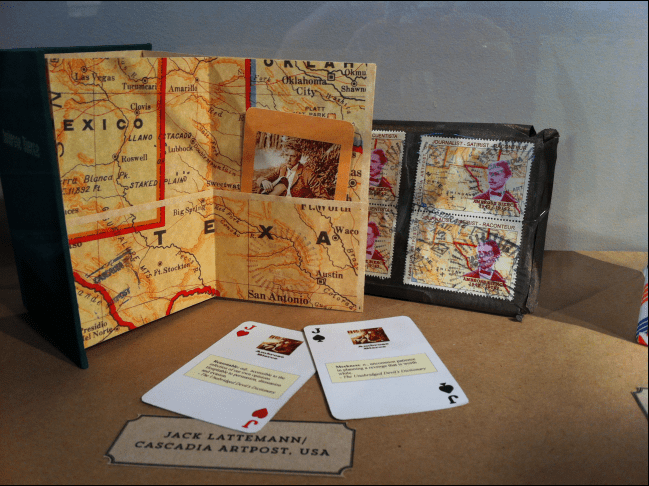 “The 100-page, four-color catalog designed by Maureen Forys of Happenstance Type-O-Rama shows every piece of exhibition artwork along with deep backgrounding essays by the curators on contemporary correspondence art and the history of West Coast mail art; the softcover catalog retails for $40.